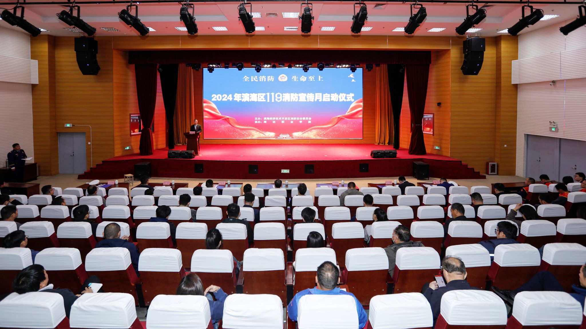 任培华致辞,介绍了学院近年来发展建设取得的成绩和“畅通生命通道、破网拆窗、电动车治理”等消防安全工作开展的情况,表示学院将以本次消防宣传月活动为契机,继续深化消防安全宣传教育,夯实消防安全工作基础,确保学院消防安全形势持续稳定,为学院及滨海区高质量发展贡献力量。