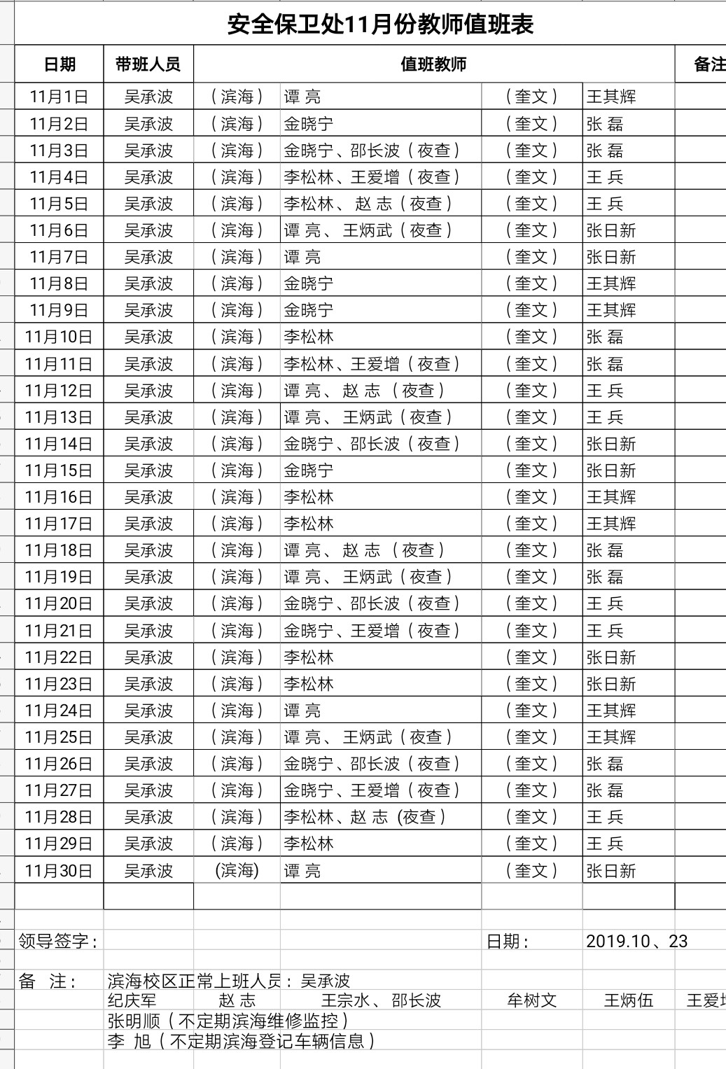 安全保卫处11月份值班表